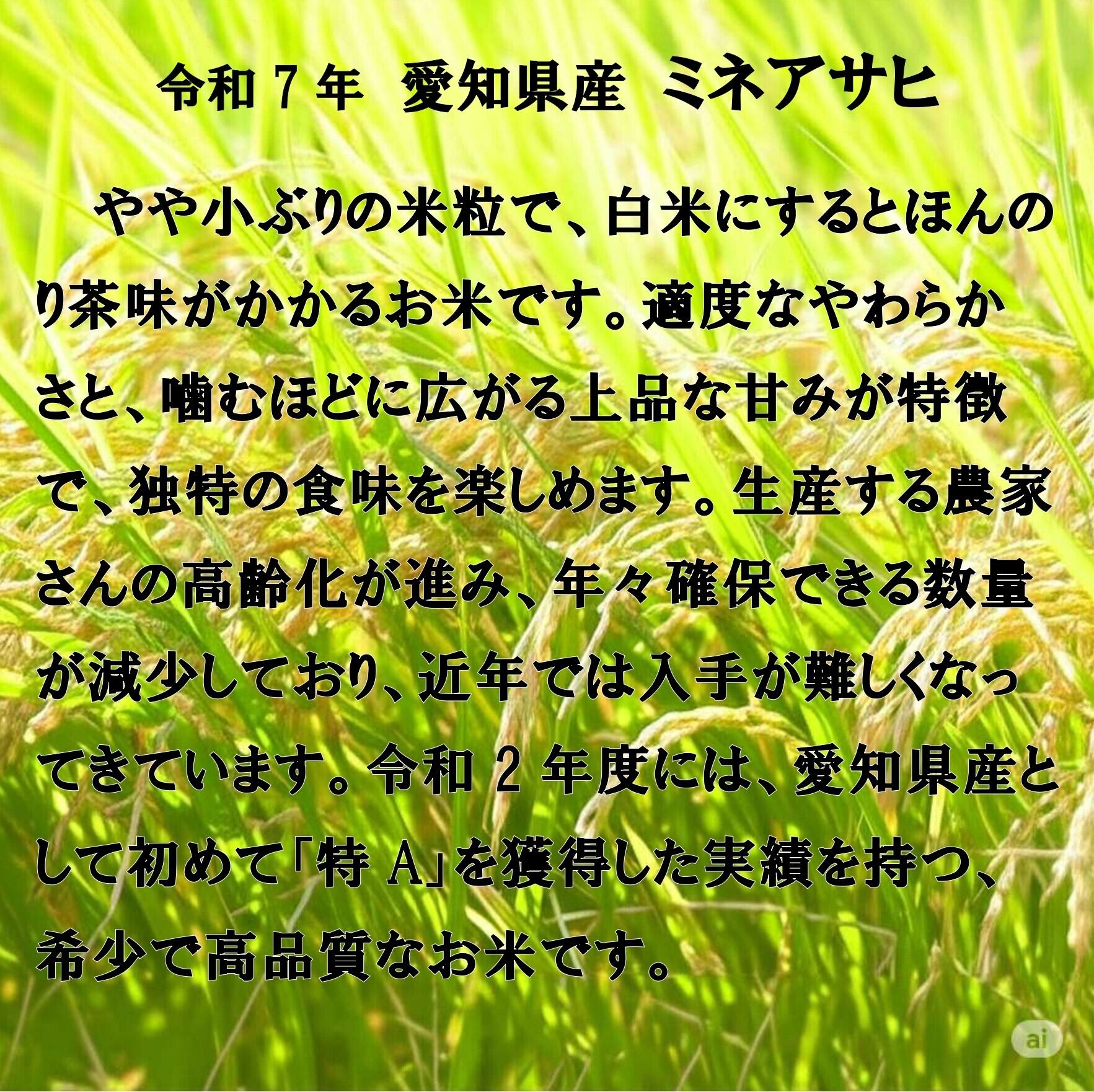 令和2年度には、愛知県産として初めて「特A」を獲得した実績を持つ、希少で高品質なお米です。